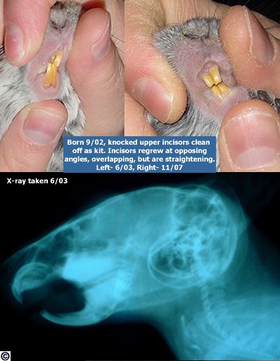 It often happens that they don’t think to mention it and a head x-ray is the ONLY WAY to be certain that malocclusion is indeed what you’re dealing with (as opposed to a dental disease of some other kind) and to discover how far it has progressed and whether the chin may benefit from immediate treatment or require euthanasia. For instance, it’s not uncommon for a vet to treat the immediate and obvious, like clipping incisor overgrowth or a molar spur when if he’d just done a head x-ray and seen that the chin’s malocclusion had already advanced to the point where euthanasia was required, it could have spared both the chin and the chinparent a lot of agony and expense. DON’T resign yourself and your chin to certain doom if you suspect malocclusion, DO get a head x-ray to know how to proceed in the best interests of your beloved chin.